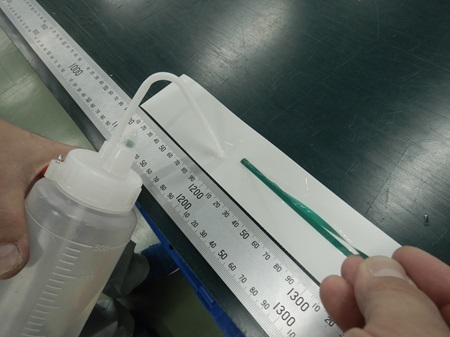 ① マーキング用シート端の未溶着部分を引っ張りながら、規定の溶剤をかける。(写真①)
