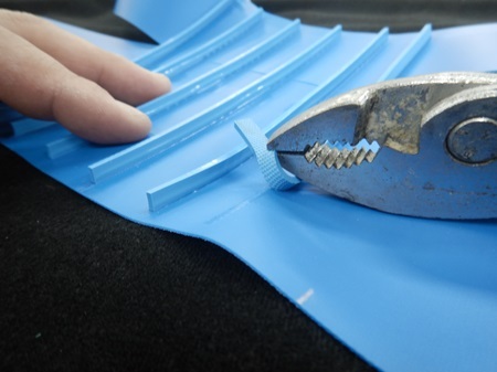 ① マーキング用シート端の未溶着部分を引っ張りながら、規定の溶剤をかける。(写真①)