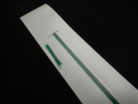 加工する製品と同じベルト材、ガイド材を部分的に溶着した供試品を用意し、規定値以上の張力があるかどうかの検査をします。