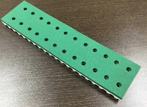 ひび割れの要因は、穴ピッチが狭いのと屈曲疲労が考えられました。設計上、穴ピッチとベルトタイプの変更は不可とのこと。搬送物の保護対策として、ベルト背面にウレタンパッドを貼る加工をご提案。クッション性とグリップ力のあるウレタンパッドを貼ることで、擦過痕のリスクを低減します。また、当社工場では、ウレタンパッドをベルトに貼ってから穴加工をするので、穴位置も合わせられます。試運転を行い、バキューム搬送と搬送物にも影響なく上手くいきました。試運転後もウレタンパットの剥がれはなく、良好に使用出来ているというお言葉を頂けました。