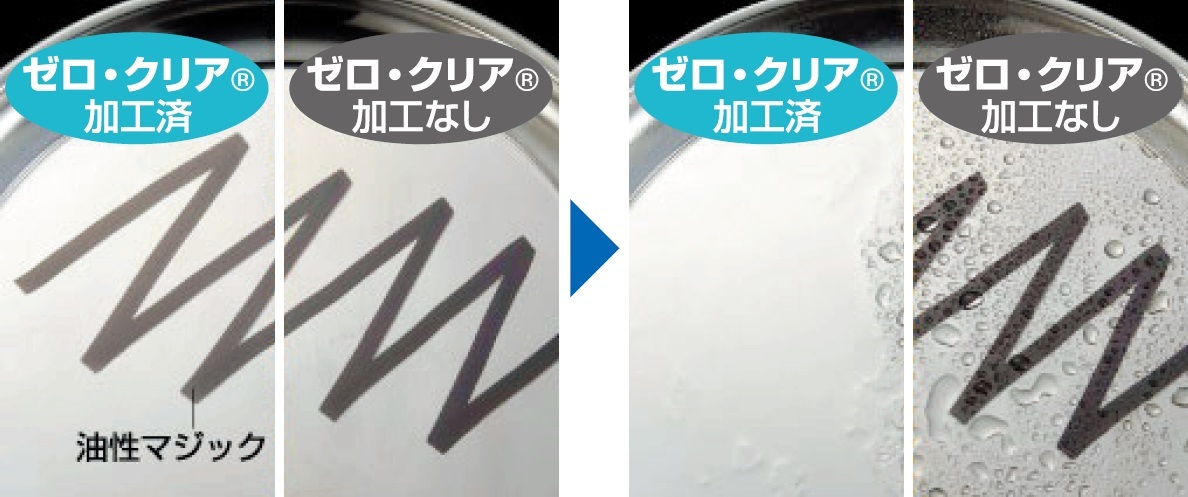㈱五合が開発した『ゼロ・クリア®』・『ゼロ・テクト®』は親水性の高い無機塗料を塗装後に焼付乾燥する加工です。